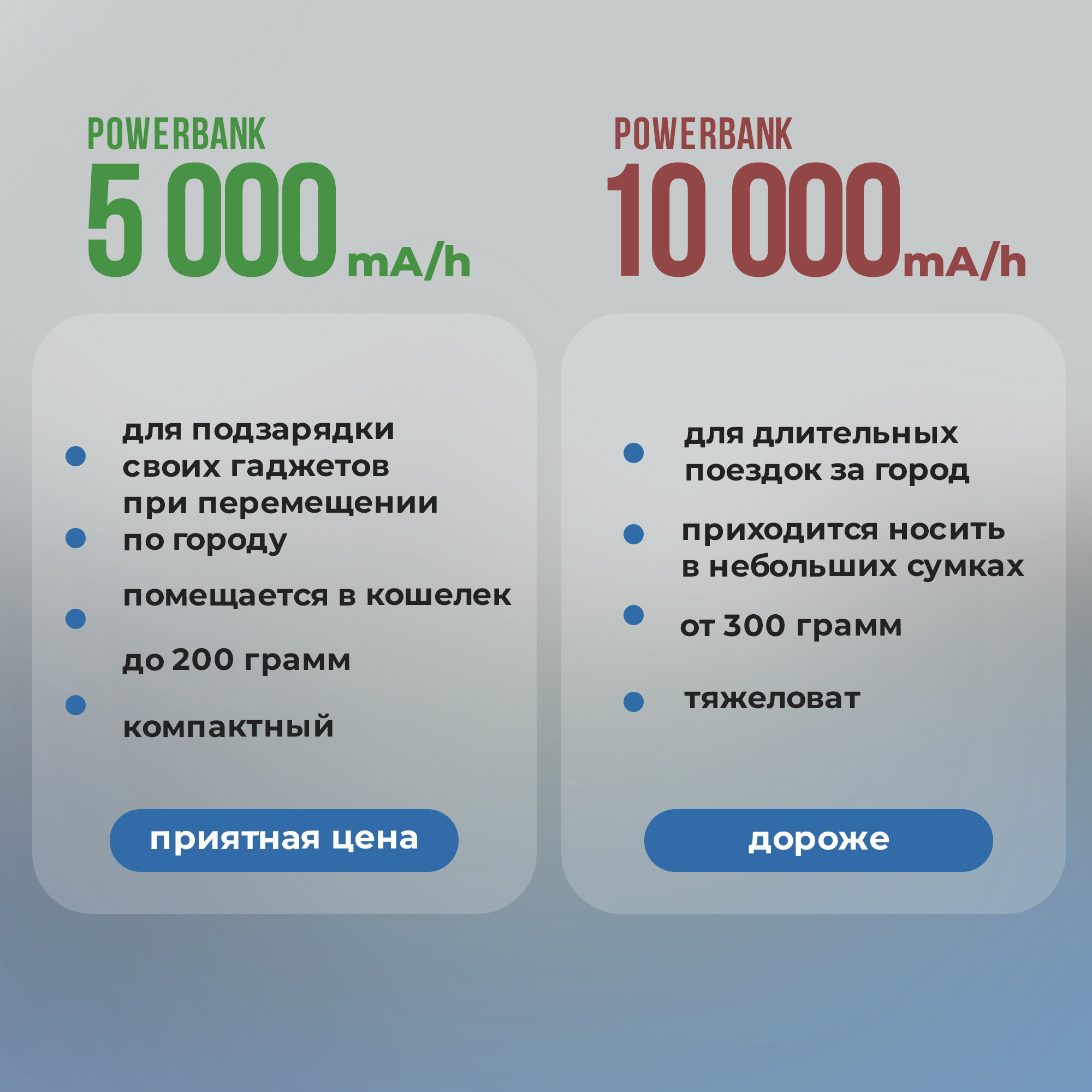 | Плюсы: | очень габаритный, весит мало...то что нужно в маленькую женскую сумку!)... хватает почти на полный заряд телефона, заряжает быстро |