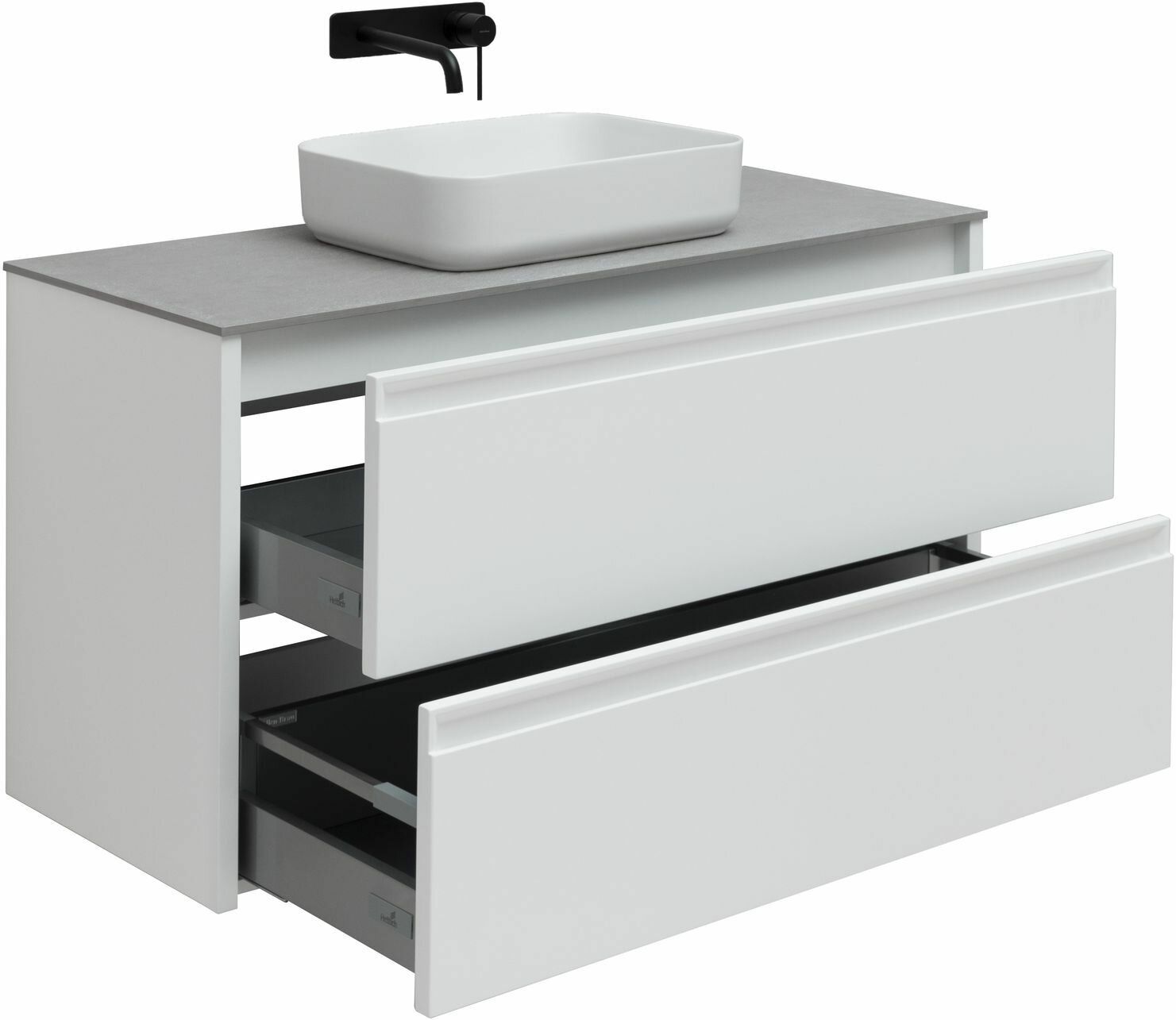 | Дополнительная информация | Плавное закрывание ящиков, полное выдвижение, прочное дно (толщина 16 мм), нагрузка до 30 кг;Надежные подвески Häfele (Germany) с возможностью регулировки по высоте, нагрузка до 130 кг;Тумбы оснащены специальной пластиковой рамой, которая надежно защищает вырез под сифон, служит органайзером и позволяет закрепить дополнительный набор контейнеров для хранения;Толщина боковых стенок тумбы и пенала 25 мм |