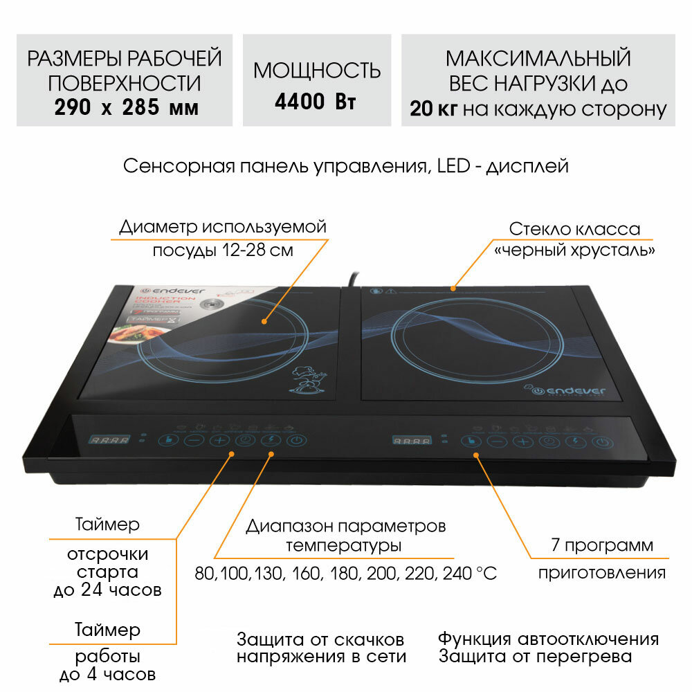 Индукционная плитка настольная электрическая Endever Skyline IP-34 / 2200+2200 Вт / до 20+20 кг / до 240 градусов / 7 программ приготовления