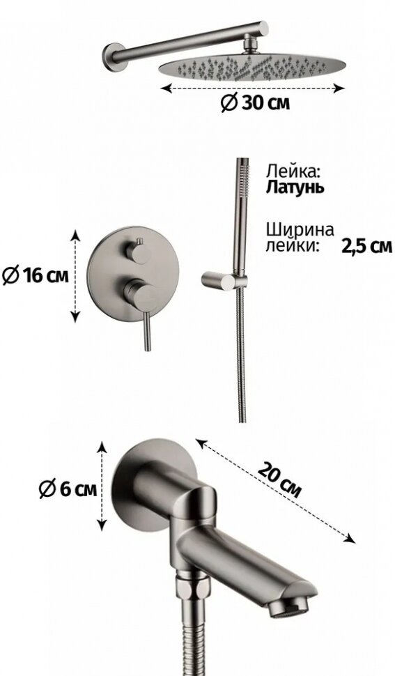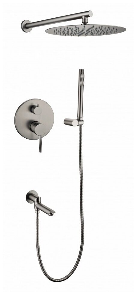 | Комплектация | вентиль / верхний душ / держатель лейки / излив для набора воды / кронштейн / лейка / ручной душ / шланг |