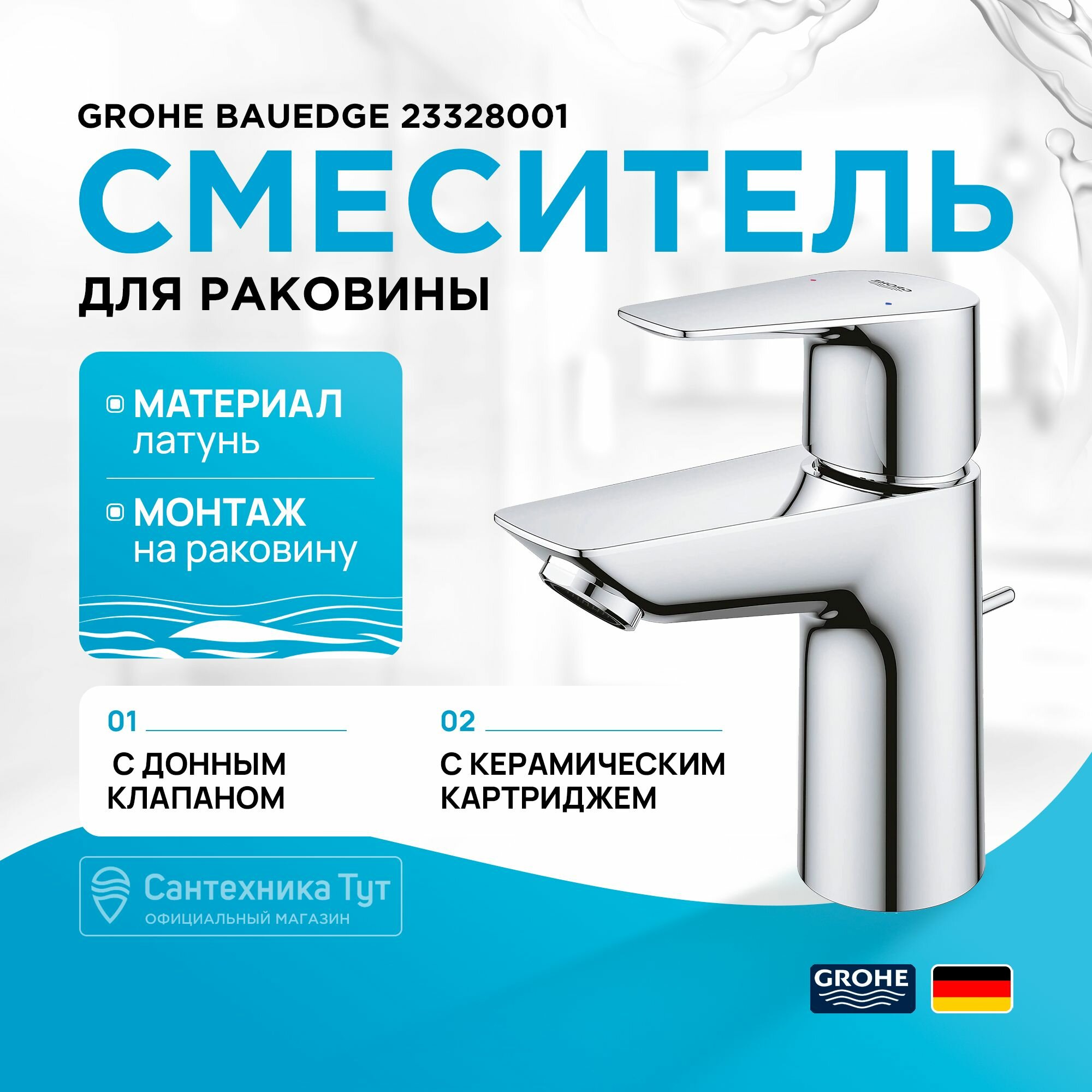Смеситель для раковины GROHE BauEdge с ограничителем температуры и рычажным донным клапаном, размер S, хром (23328001)