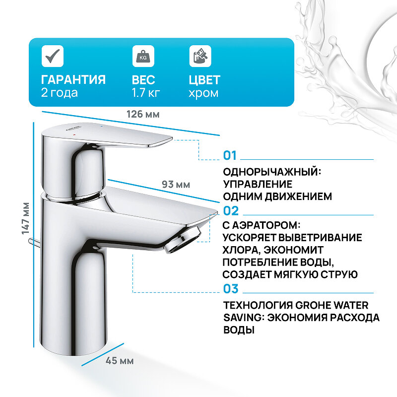 Смеситель для раковины Grohe BauEdge, размер S, EcoJoy, хром 23328001