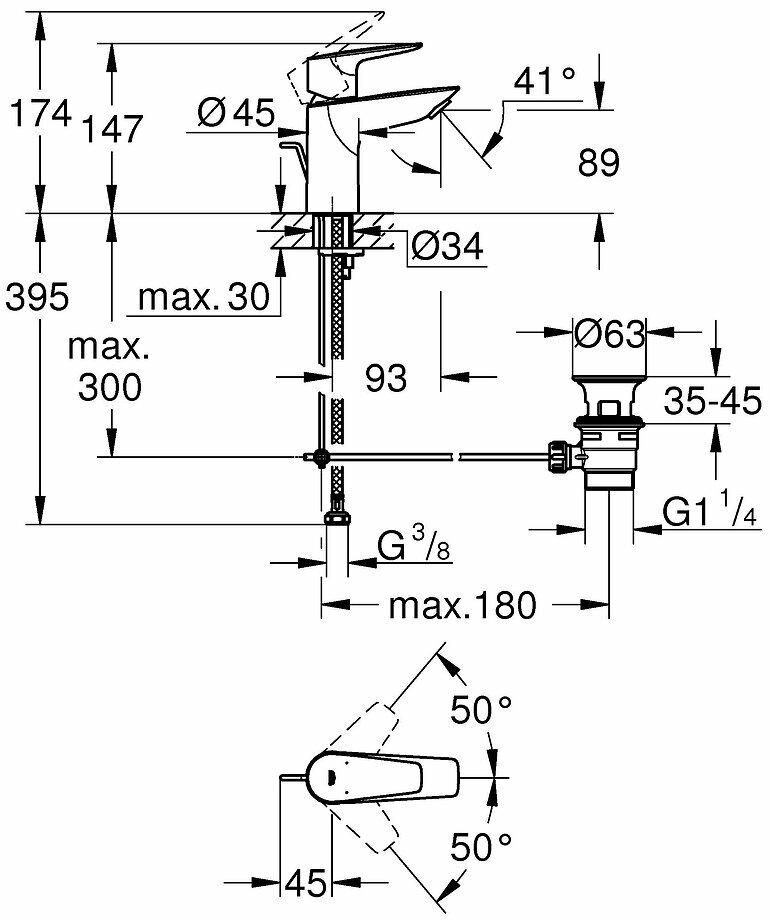Смеситель для раковины Grohe BauEdge с ограничителем температуры и рычажным донным клапаном, S-Size, хром (23328001)