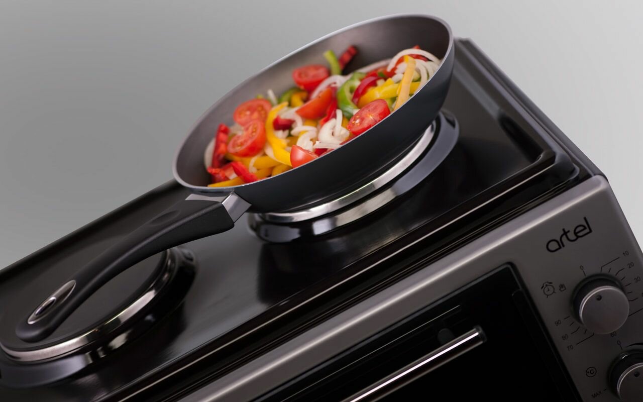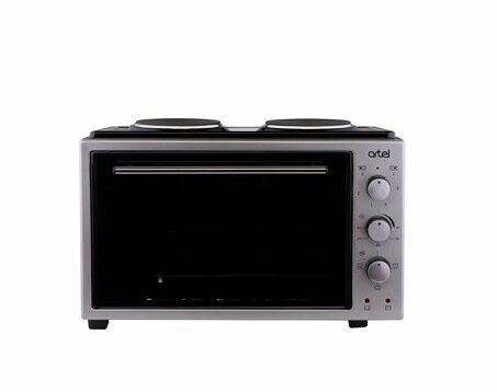 Мини печь ARTEL MD 3614 черно-серая, объем 36 л, 2 электроконфорки, 3 режима работы духовки, 2 противня, хромированная решетка интересное: