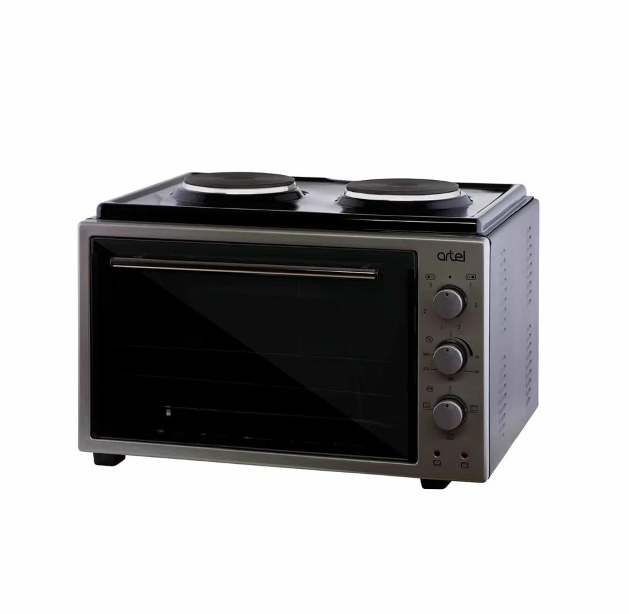 Купить Мини печь ARTEL MD 3614 черно-серая, объем 36 л, 2 электроконфорки, 3 режима работы духовки, 2 противня, хромированная решетка