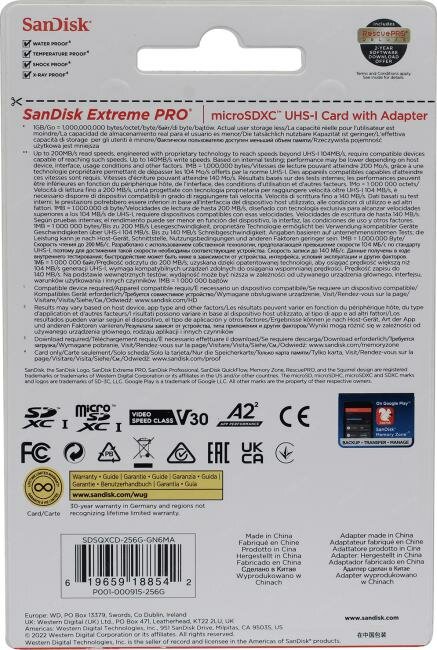 Карта памяти Sandisk Extreme Pro microSDXC 256GB + SD Adapter + Rescue Pro Deluxe 170MB/s A2 C10 V30 UHS-I U3