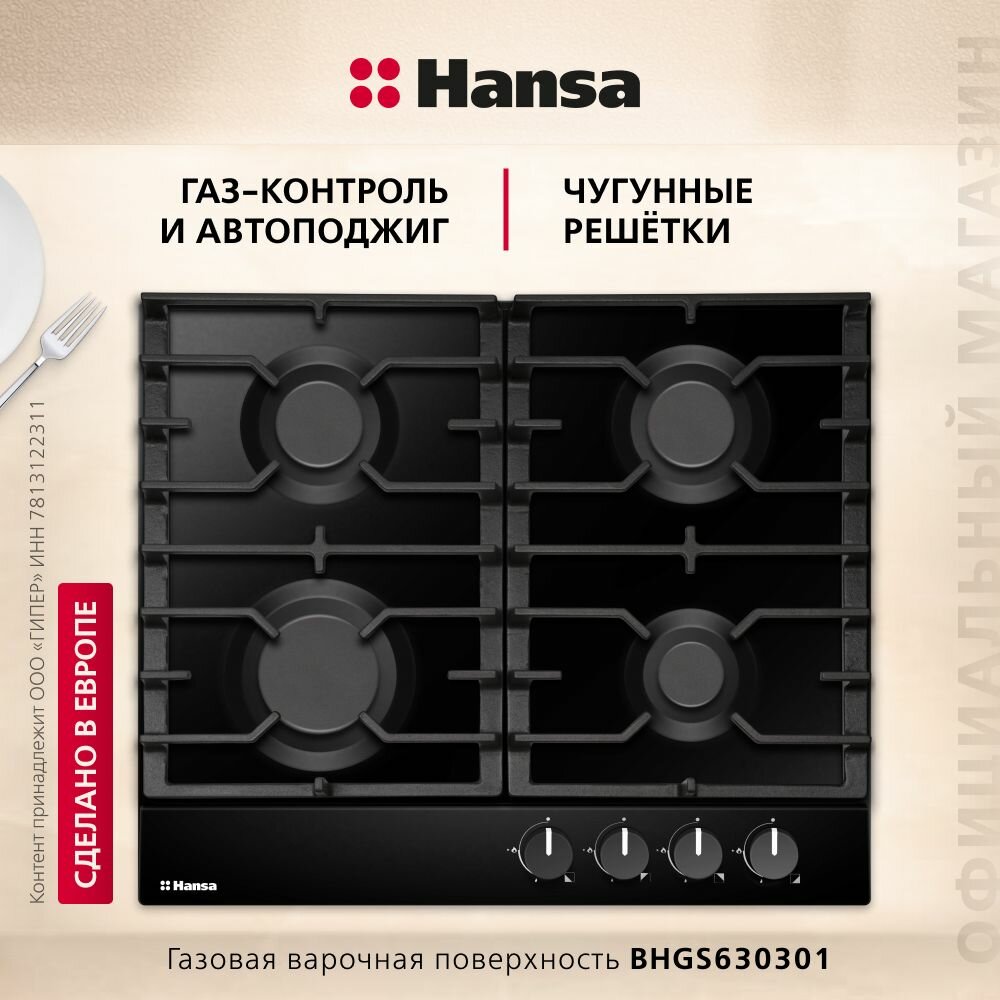 Газовая варочная поверхность Hansa BHGS630301, с газ-контролем и автоподжигом, черная