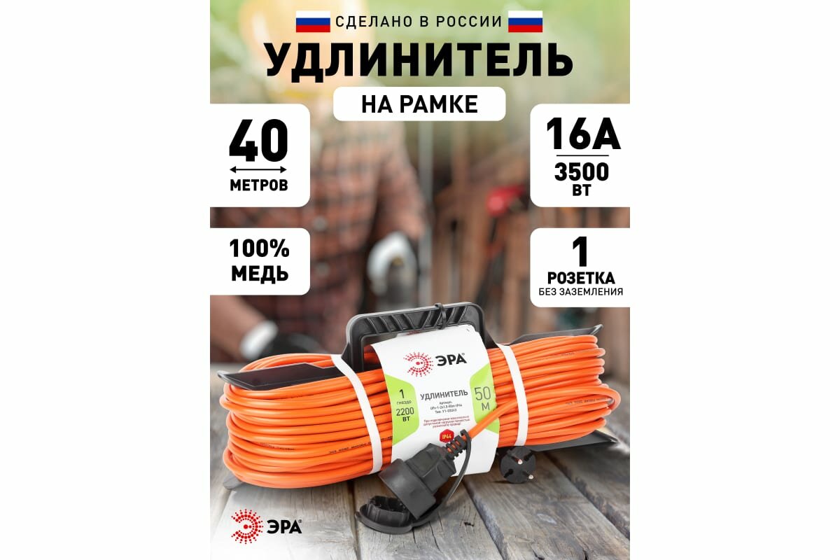 Удлинитель-шнур на рамке 1х50м без заземл. 16А IP20 UFx-1-2х1.5-50m ПВС 2х1.5 Эра Б0046823 rs-Б0046823