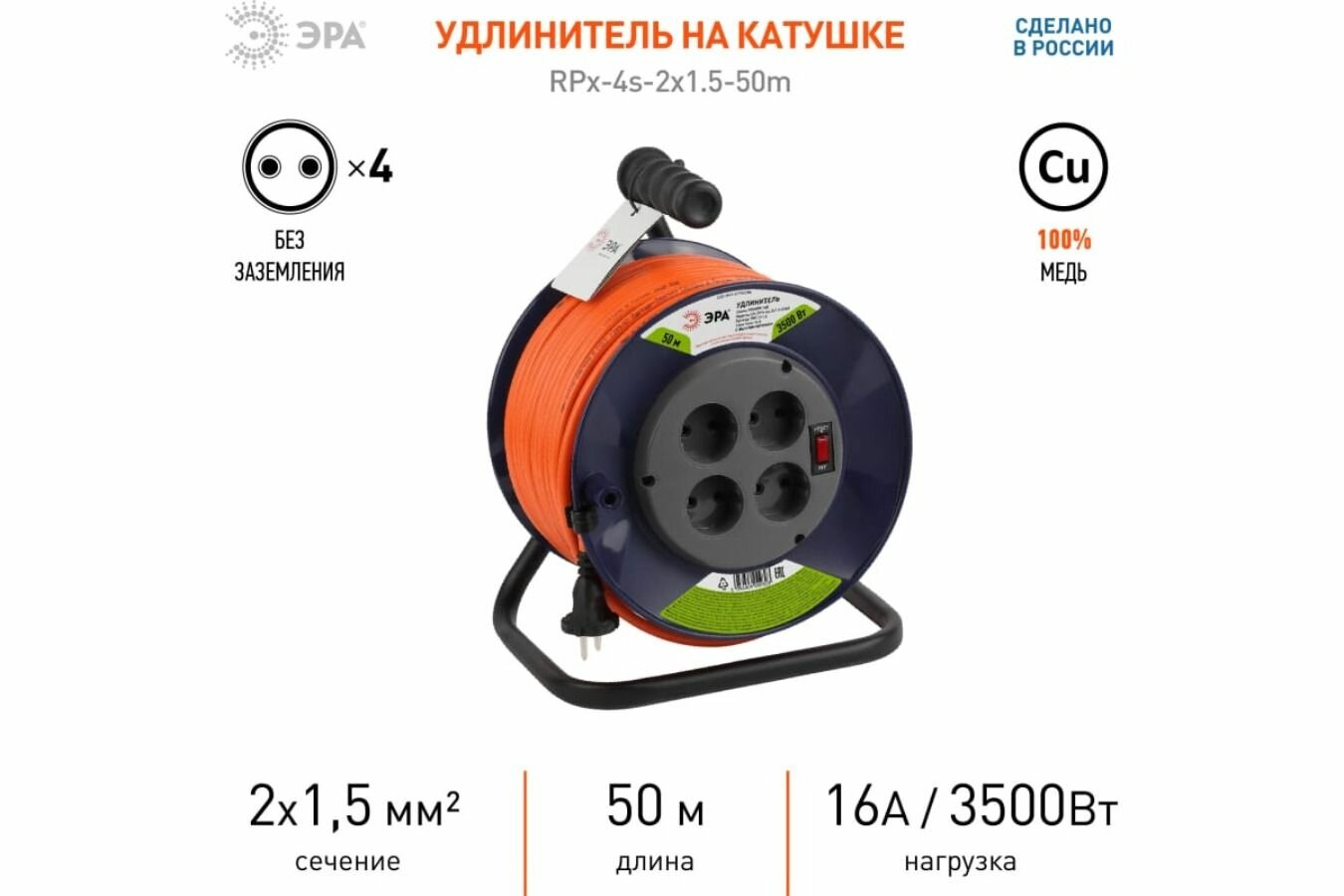 Удлинитель силовой Эра RPx-4s-2x1.5-50m, розеток 4шт, 2x1.5 кв.мм, 10A, 50м, ПВС, катушка, оранжевый