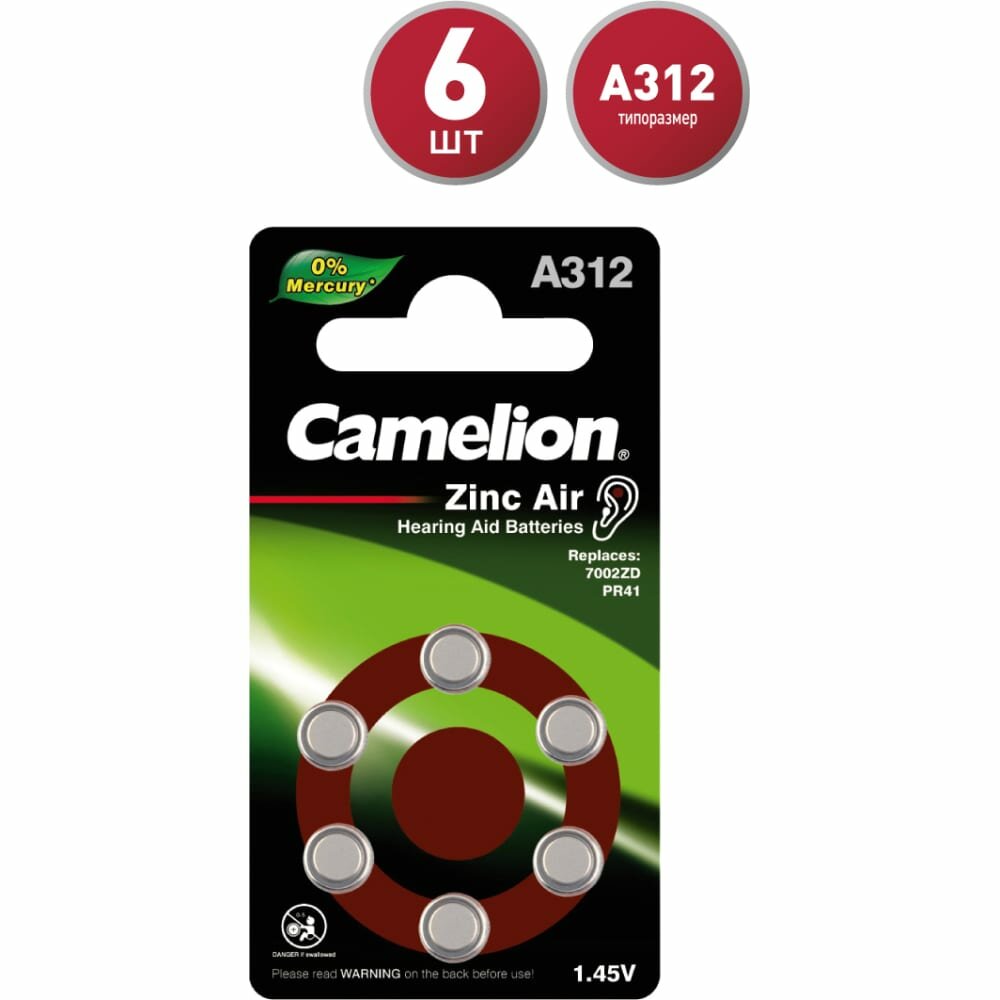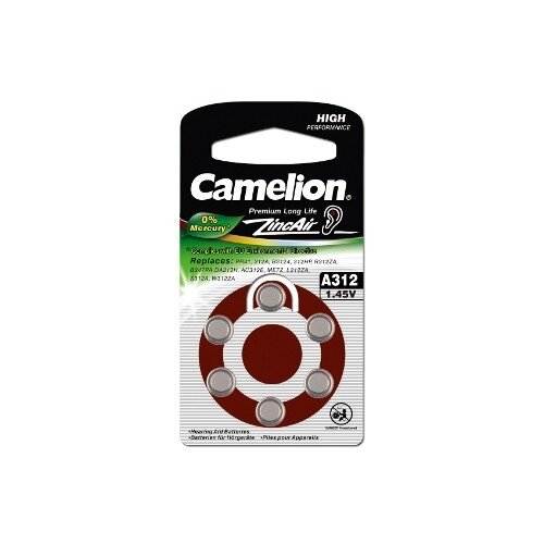 Camelion ZA312 BL-6 Mercury Free (A312-BP6(0%Hg), батарейка для слуховых аппаратов, 1.4 V,170mAh) (6 шт. в уп-ке)