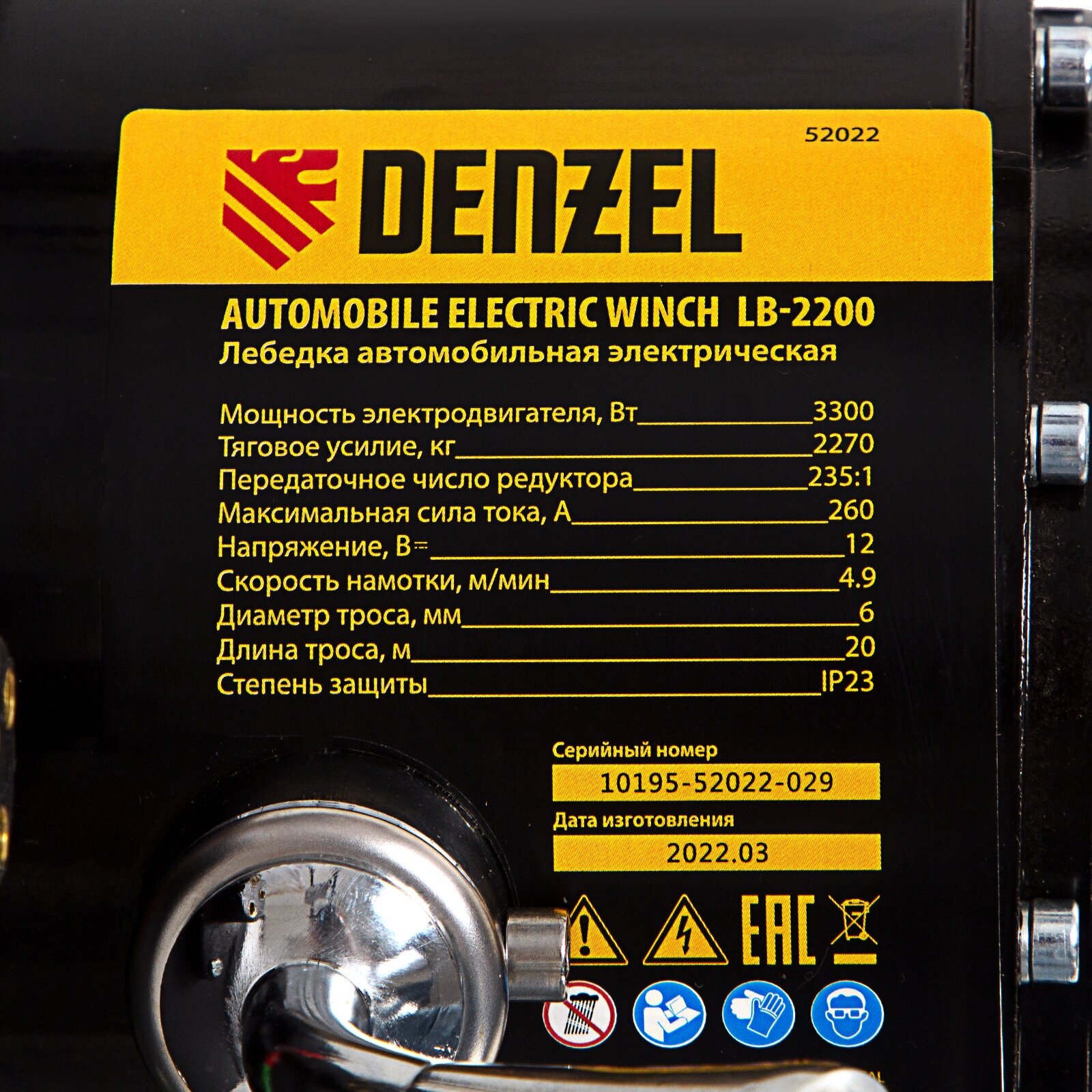 Лебедка автомобильная электрическая LB-2200, 2.2 т, 3.3 кВт, 12 В Denzel