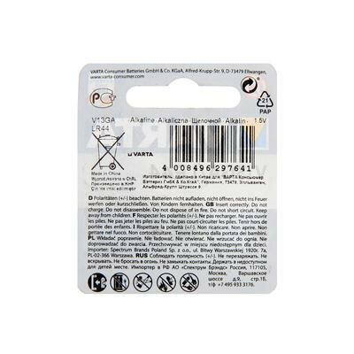 Купить Батарейка алкалиновая Varta, LR44 (V13GA) - 1BL, 1.5 В, блистер, 1 шт.