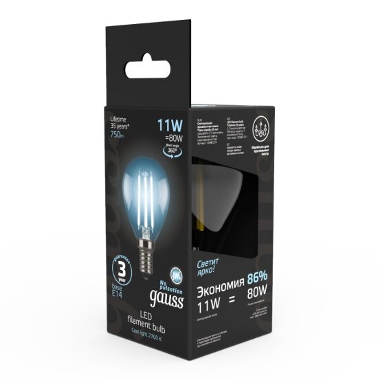 Ниже Вы можете прочитать отзывы на Светодиодная лампа Gauss LED Filament Шар E14 11W 750lm 4100K, ознакомится с подробными характеристиками, посмотреть интересные обзоры и фотографии на Светодиодная лампа Gauss LED Filament Шар E14 11W 750lm 4100K.