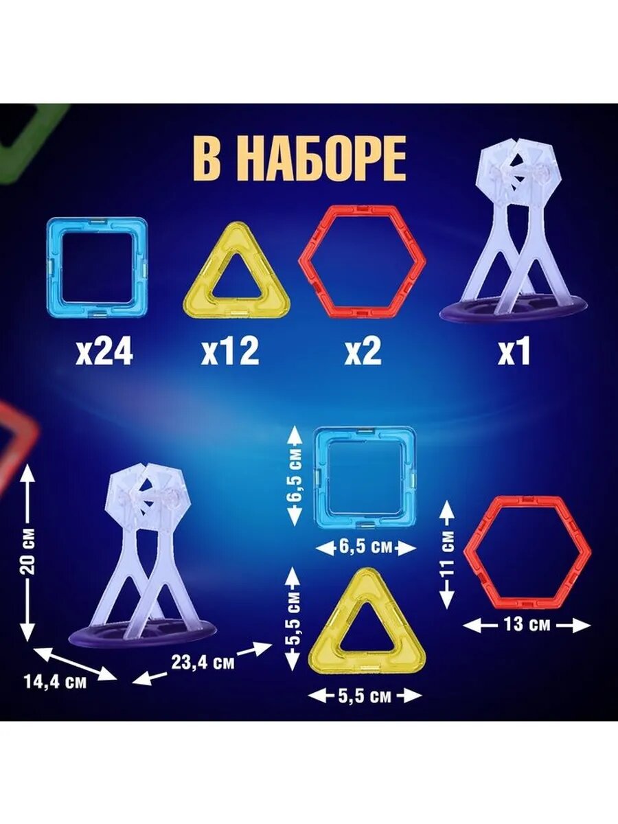 | Дополнительная информация | размеры: квадрат - 6,5 х 0,5 х 6,5 см, треугольник - 5,3 х 0,5 х 5 см, шестиугольник - 12,5 х 0,5 х 11 см; конструктор совместим с наборами ТМ Magformers и Mag-Building |