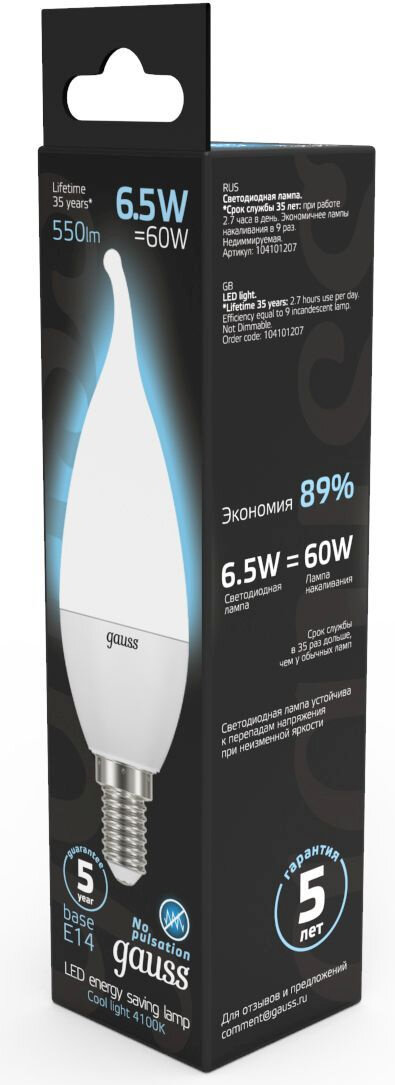 Лампа светодиодная gauss 104101207, E14, CA35, 6.5 Вт, 4100 К