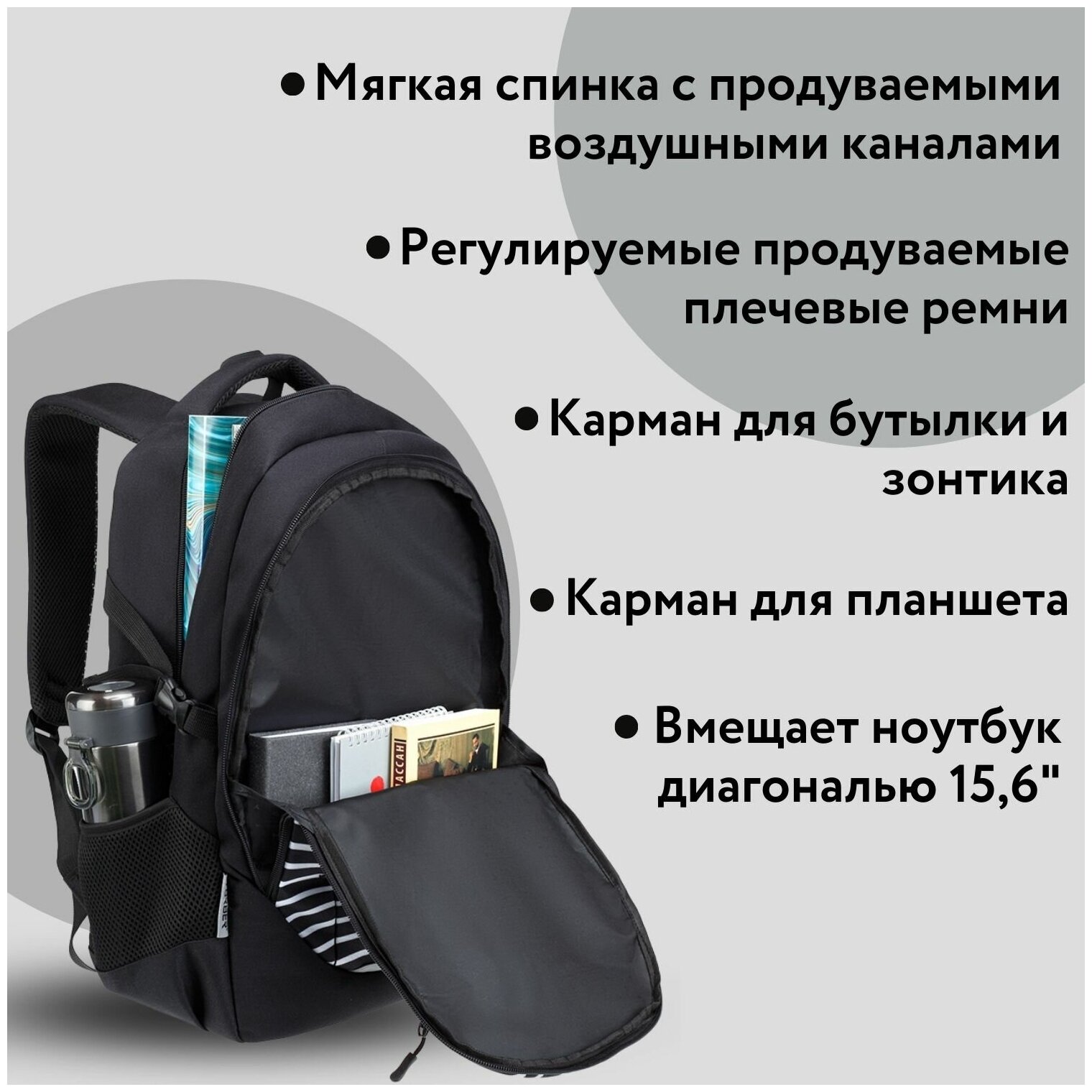 | Дополнительная информация | основное отделение вмещает ноутбук диагональю 15" |