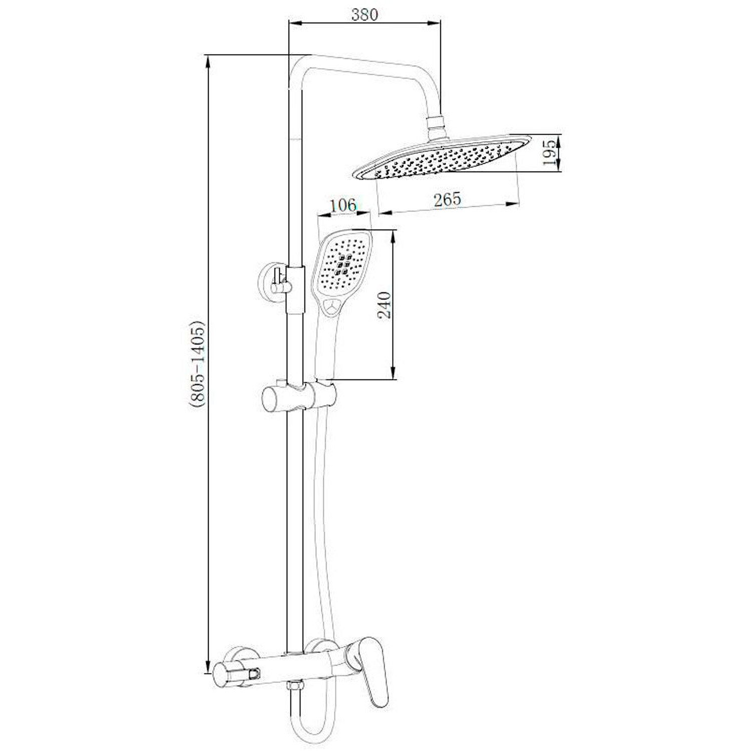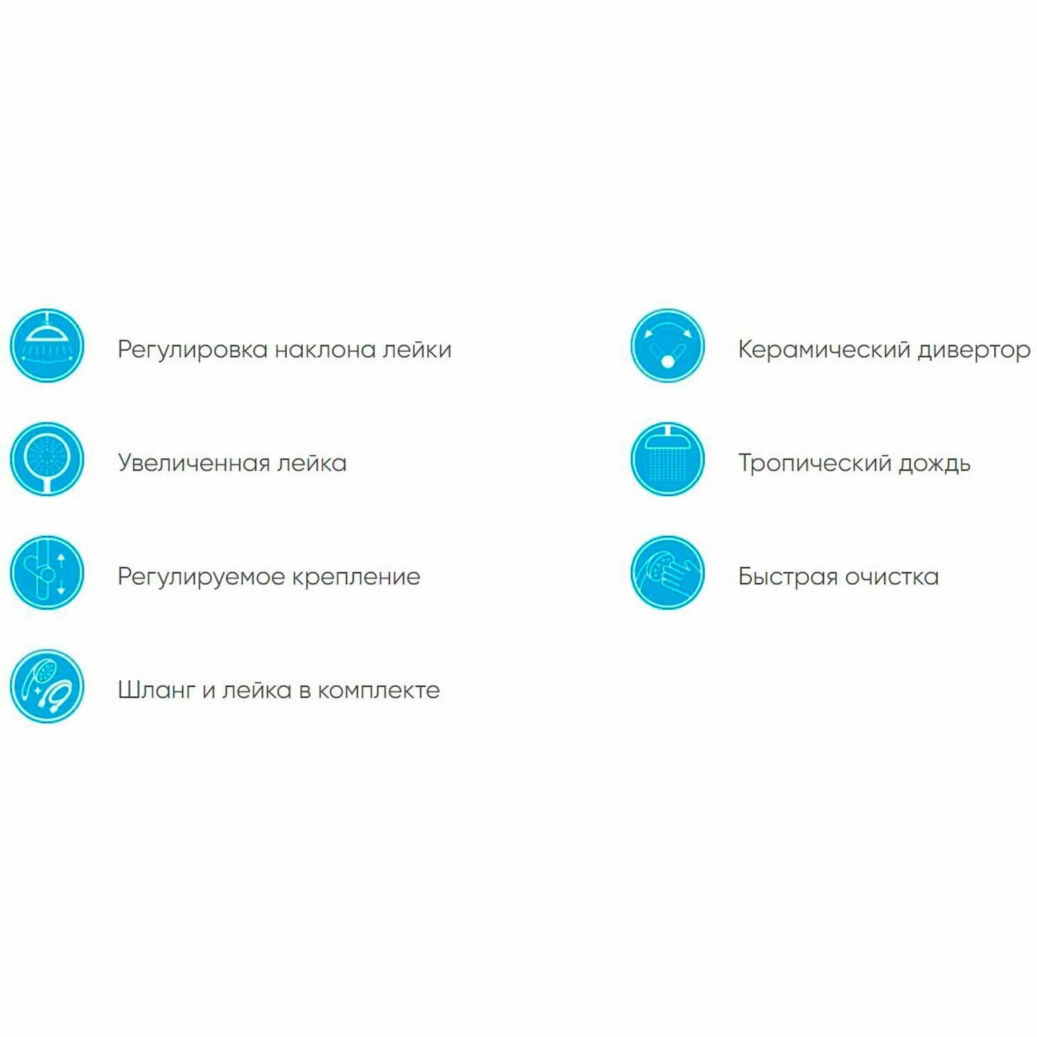 | Комплектация | 3-режимная лейка / верхний душ 230 мм / шланг для душа 1500 мм |