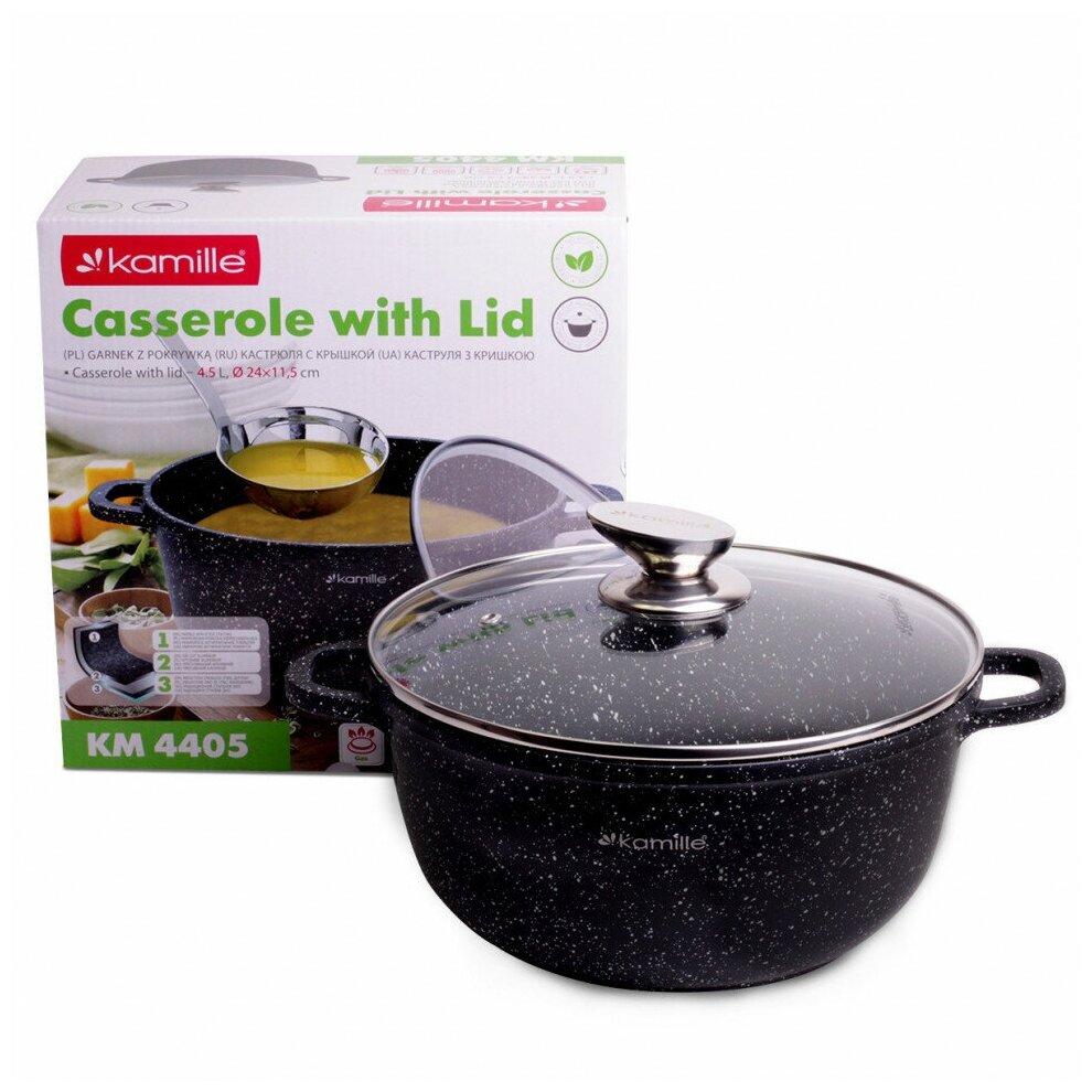 Кастрюля 4,5 л. из литого алюминия с покрытием черный мрамор Kamille KM-4405 (24х11,5 см) (4,5 л. / черный)