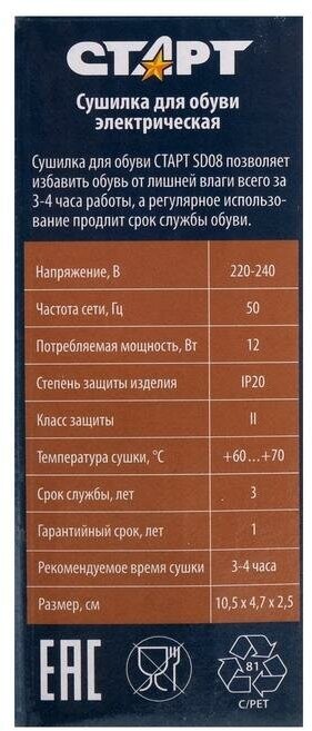 Сушилка для обуви старт SD04, 12 Вт, шнур 1.2 м