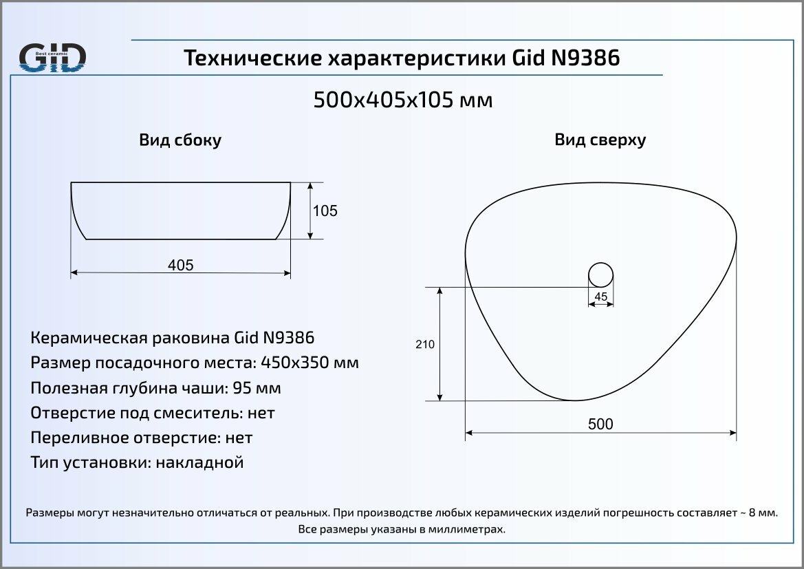 Раковина Gid N9386 накладная 50х40,5х10,5 белая