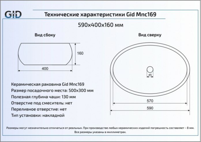 Накладная раковина для ванной Gid Mnc169 с донным клапаном