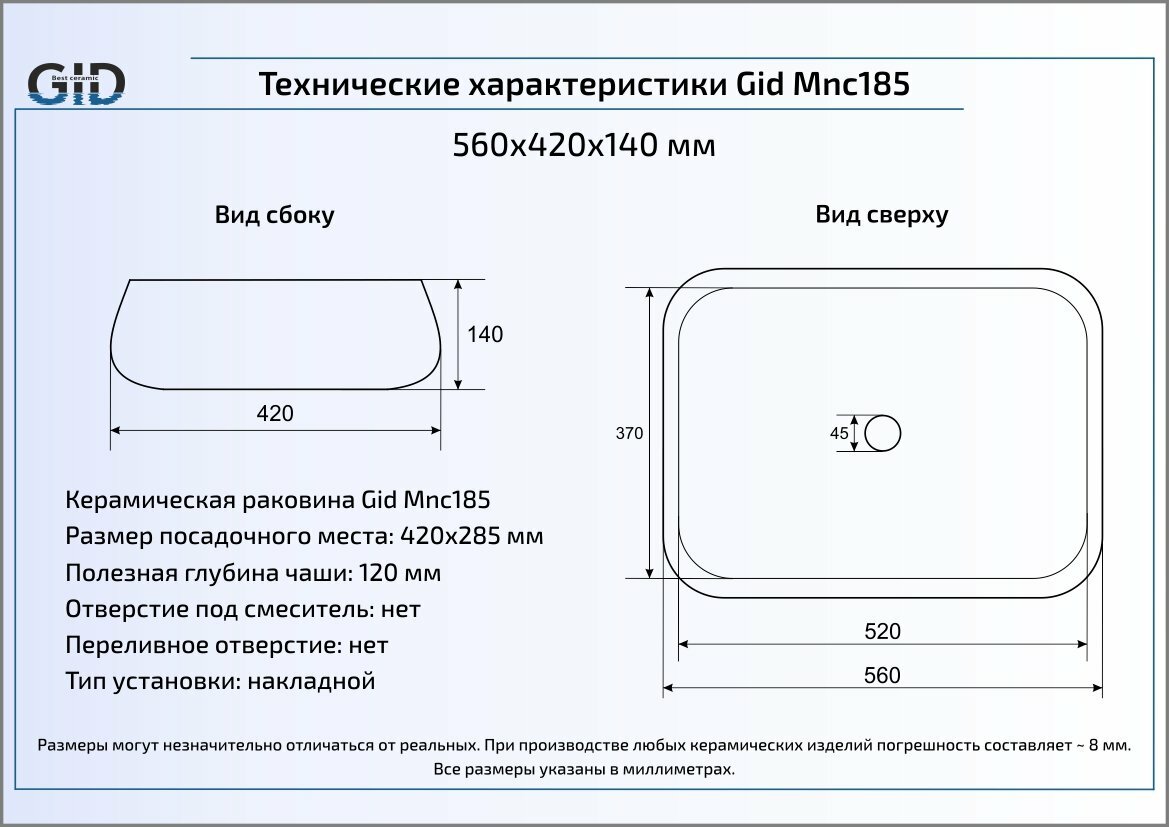 Накладная раковина для ванной Gid Mnc185 с донным клапаном