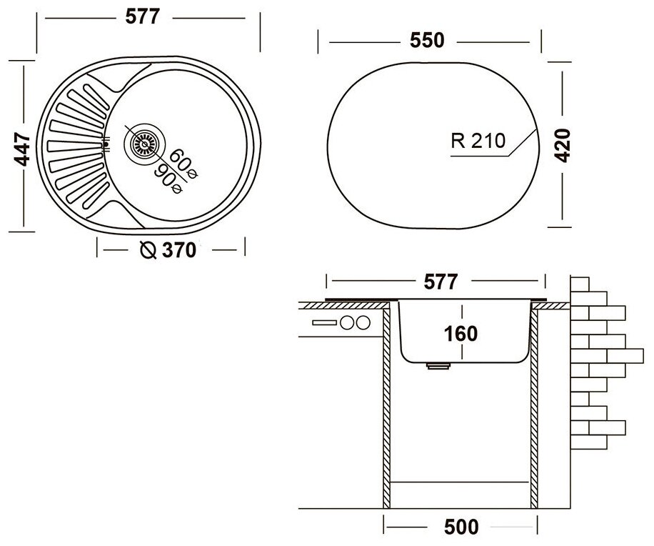 Мойка для кухни Ukinox Nord 577х447х160 мм врезная овальная с крылом сталь (Nr 577х447 (0,6) R, G)
