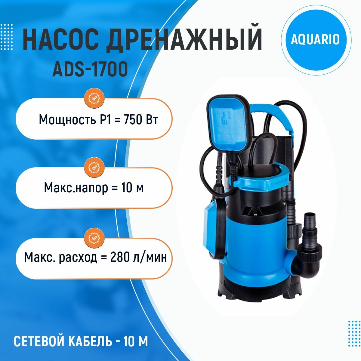 Дренажный насос Aquario ADS-1700 (Кабель 10 метров), (750 Вт)