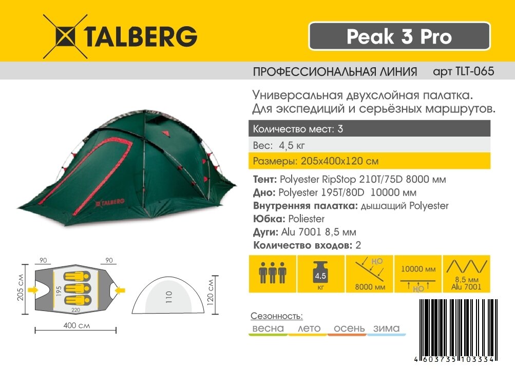Палатка Talberg Peak pro 3 green Водостойкость 8000 мм, вес 4кг