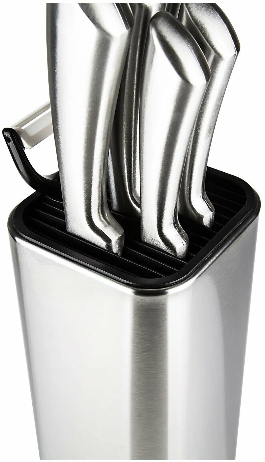 | Комплектация | - поварской нож; - нож для хлеба; - нож для нарезки; - универсальный нож; - нож для чистки овощей и фруктов; - керамический пиллер; - металлическая прямоугольная подставка. |