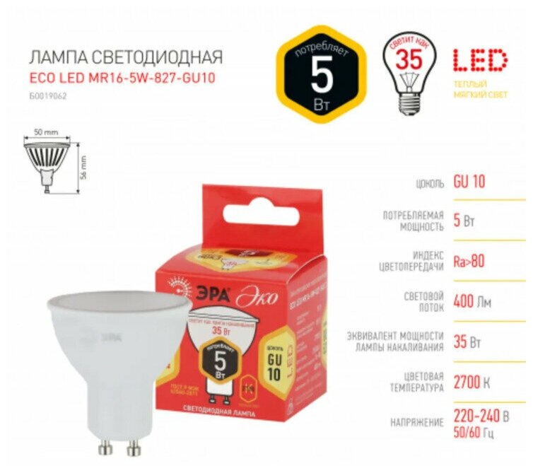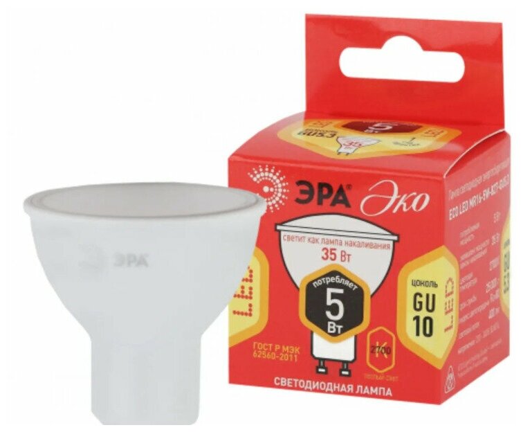 ЭРА Лампа светодиодная ЭРА GU10 5W 2700K матовая ECO LED MR16-5W-827-GU10 Б0019062