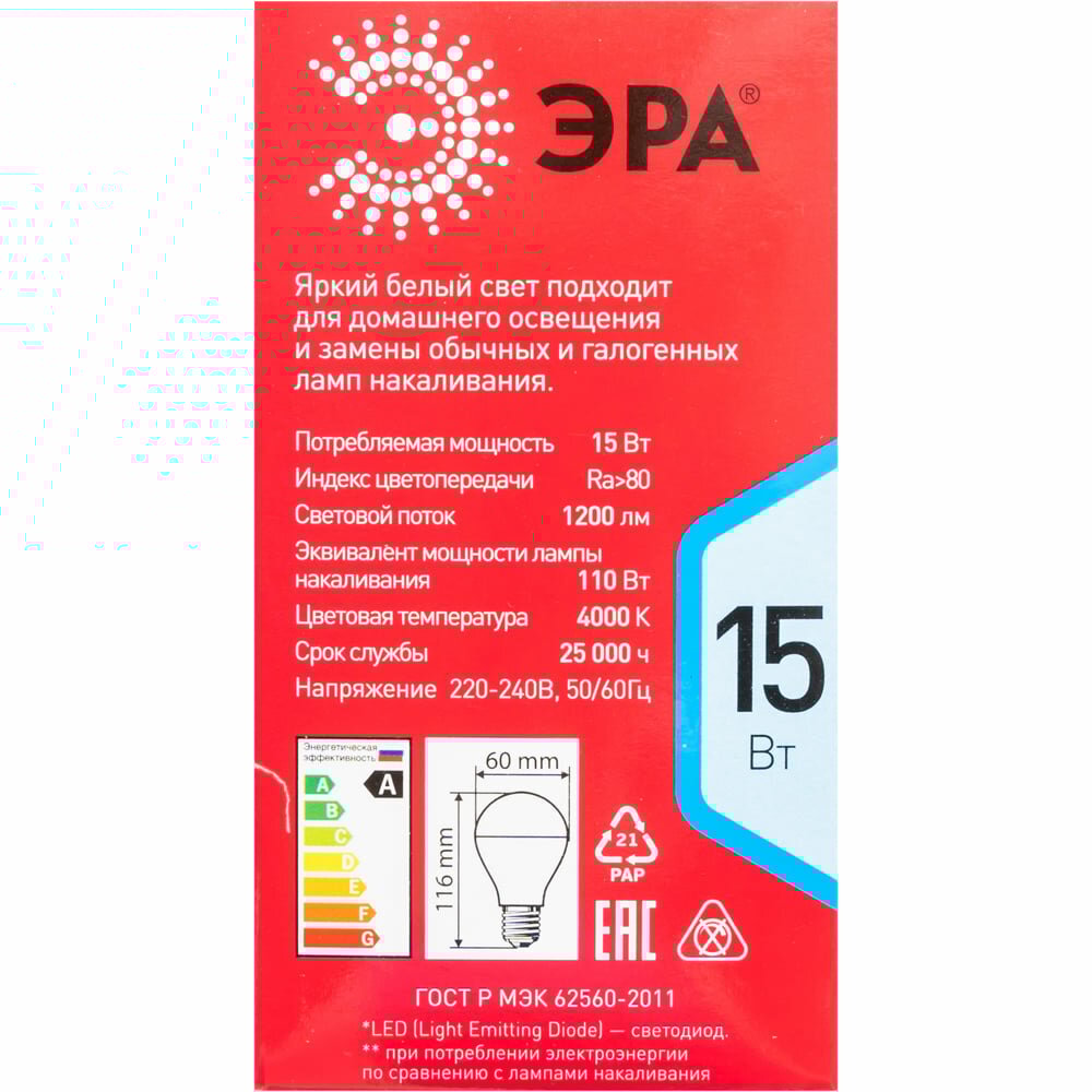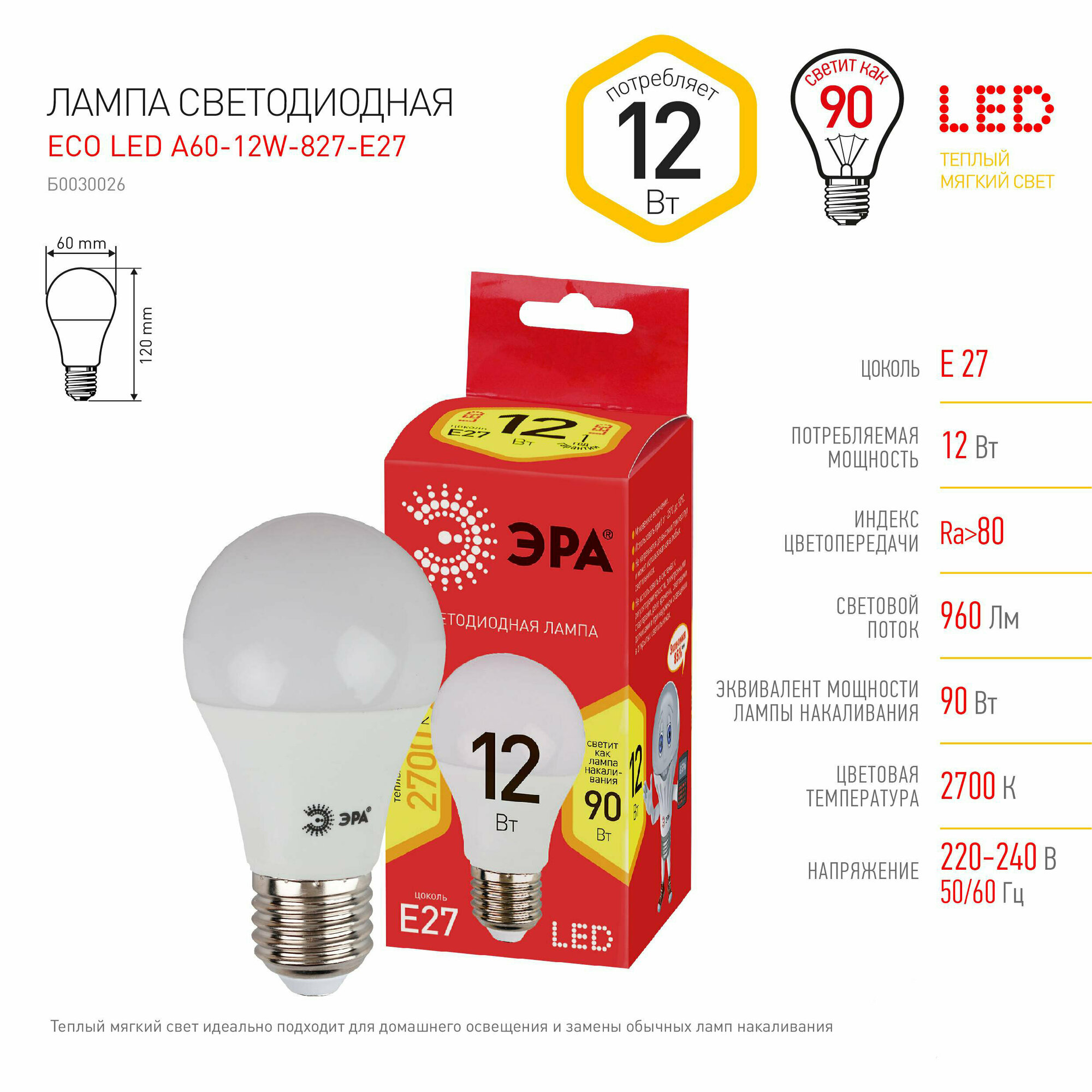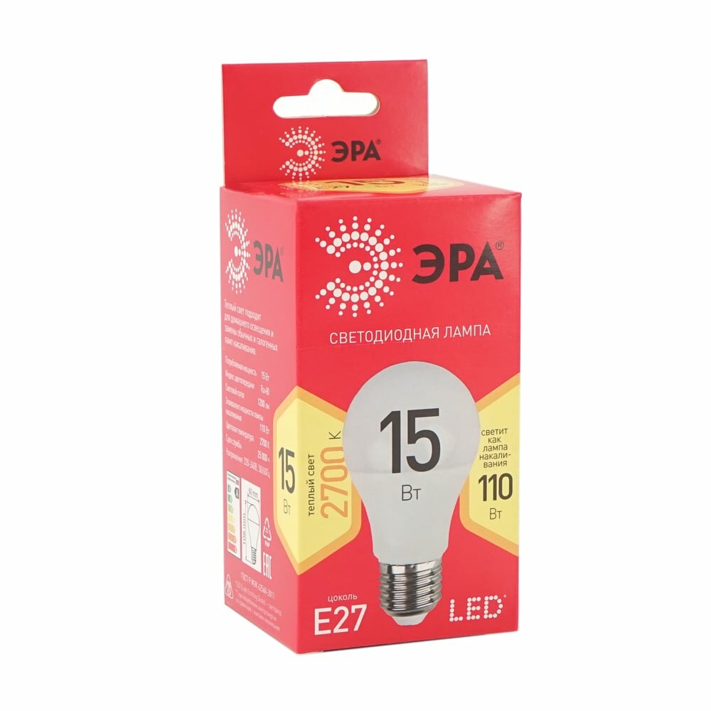 Лампа светодиодная ЭРА ECO LED A60-12W-827-E27 (диод, груша, 12Вт, тепл, E27) интересное: