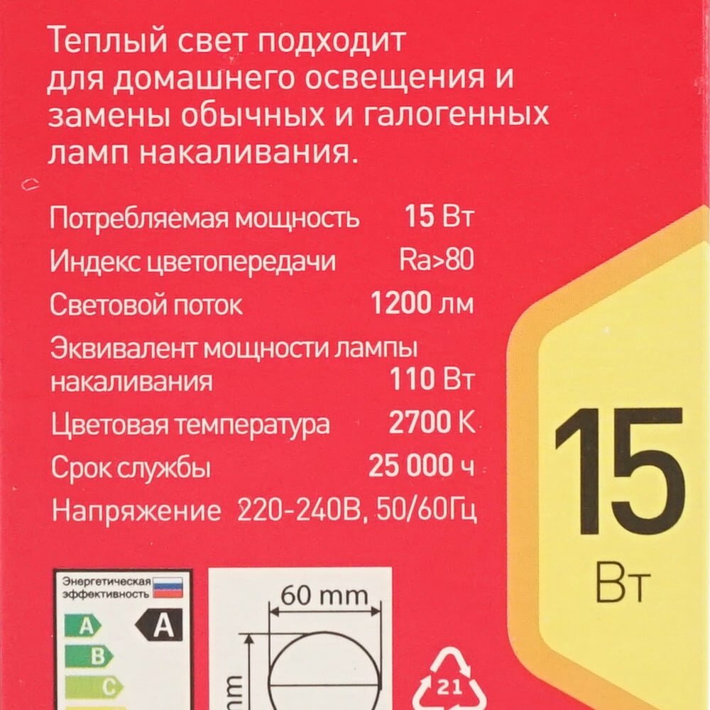 | Эквивалент лампы накаливания | 80 Вт |