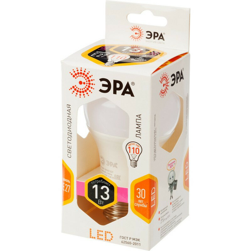 Лампа светодиодная Эра 13W E27 2700k тепл.бел. ст.колба LED A60-13W-827-E27 , 1 шт. интересное:
