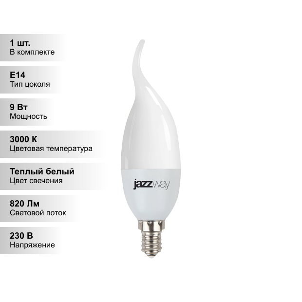 Лампа светодиодная jazzway 2859518A, E14, CA37, 9 Вт, 3000 К