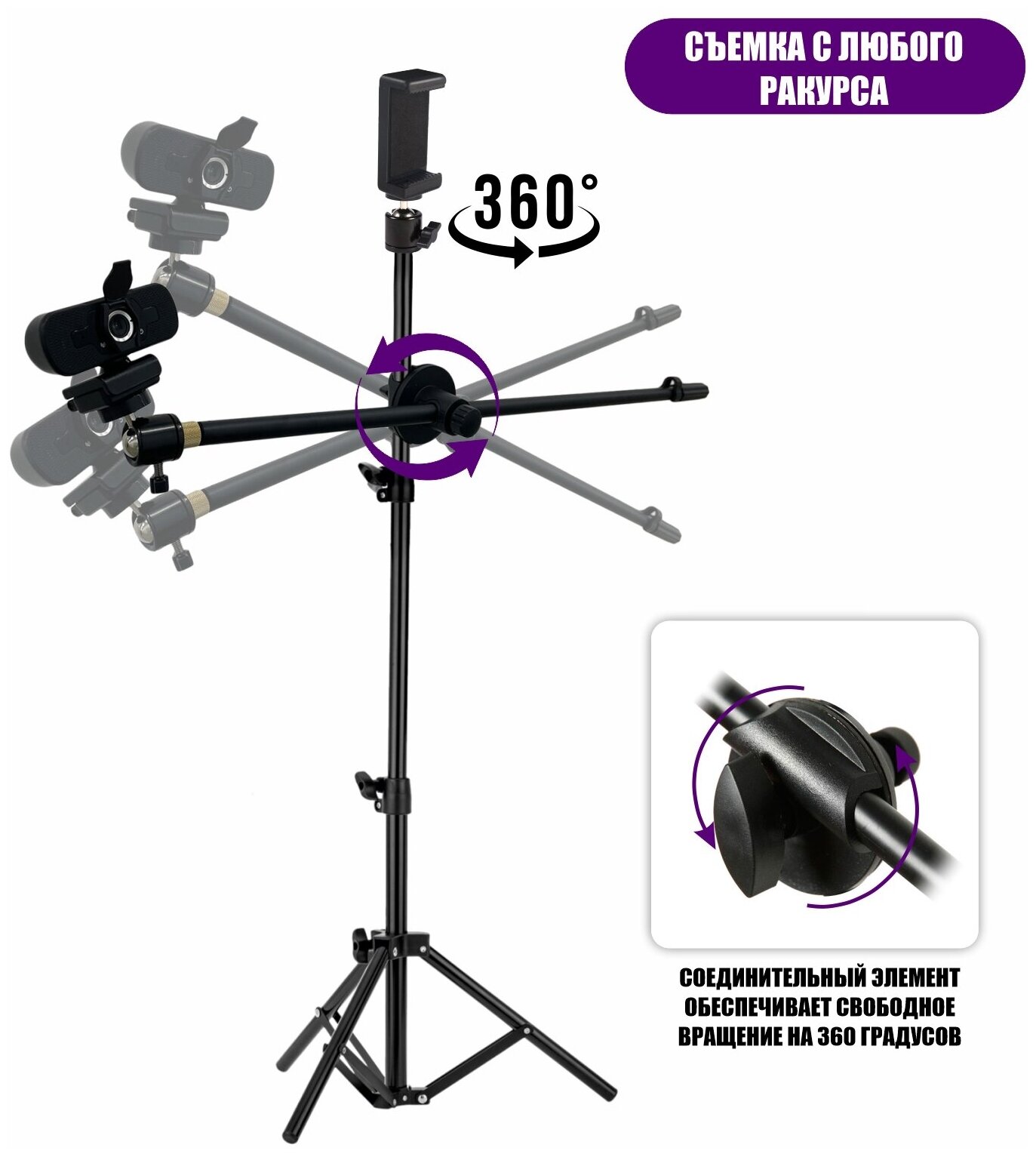 | Дополнительная информация | Особенности: - Лаконичный дизайн. - Высококачественный материал. - Возможность дополнительно установить кольцевую лампу на штатив для более качественной фото и видео съемки. - Поворот журавля на 360 градусов. - Возможность снимать фото и видео контент как в вертикальном, так и в горизонтальном положении. - Удобная площадка с возможностью крепления как на экране монитора, так и на стойке. - Компактность и мобильность. - Автоматическая регулировка яркости. - Ручная фокусировка. - Телескопический штатив с возможностью подобрать оптимальную высоту. - Устойчивая и надежная опора - Возможность установить шарнирное крепление как на штатив, так и на журавль, в зависимости от Ваших требований. |
