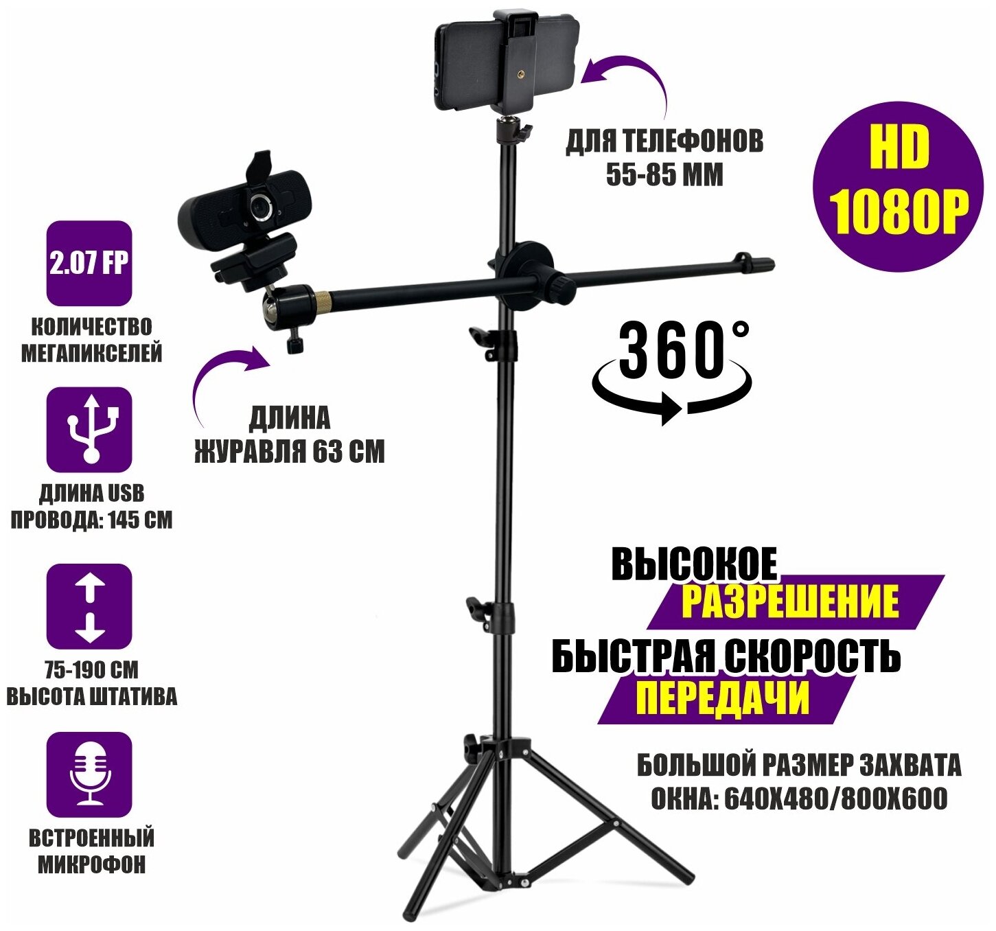 Веб-камера Full HD 1080P WEB-ZK-JG1 на напольной стойке с держателем для телефона для горизонтальной и вертикальной съемки интересное: