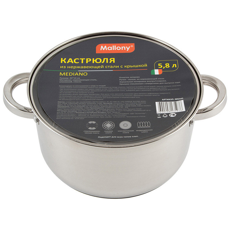 Mallony Mediano 005445, Кастрюля 5,8 л (нержавеющая сталь, стеклянная крышка)