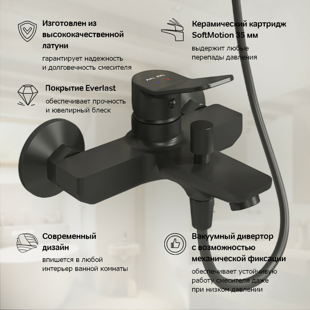 Смеситель для ванны с душем AM.PM Brava, черный матовый, кран для ванной, короткий излив 164 мм, керамический картридж, покрытие Everlast, Германия, латунь, Гарантия 10 лет