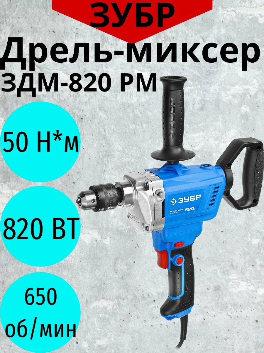 Дрель-миксер Зубр ЗДМ-820 РМ, 0-650 об/мин, 820 Вт