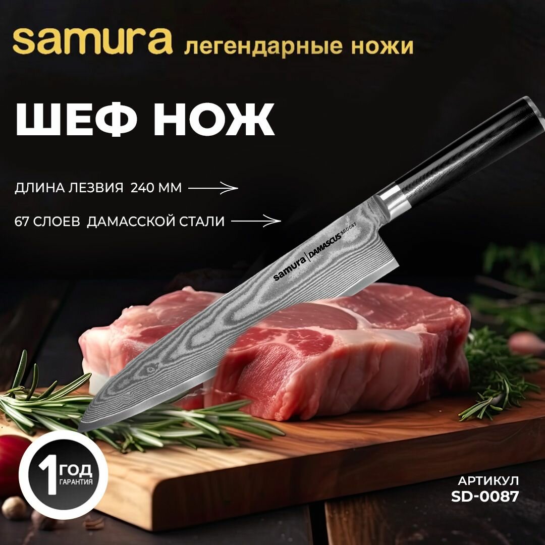 Шеф нож для нарезки мяса, рыбы, овощей и фруктов / кухонный нож дамасский / поварской нож для кухни Samura Damascus 240мм SD-0087