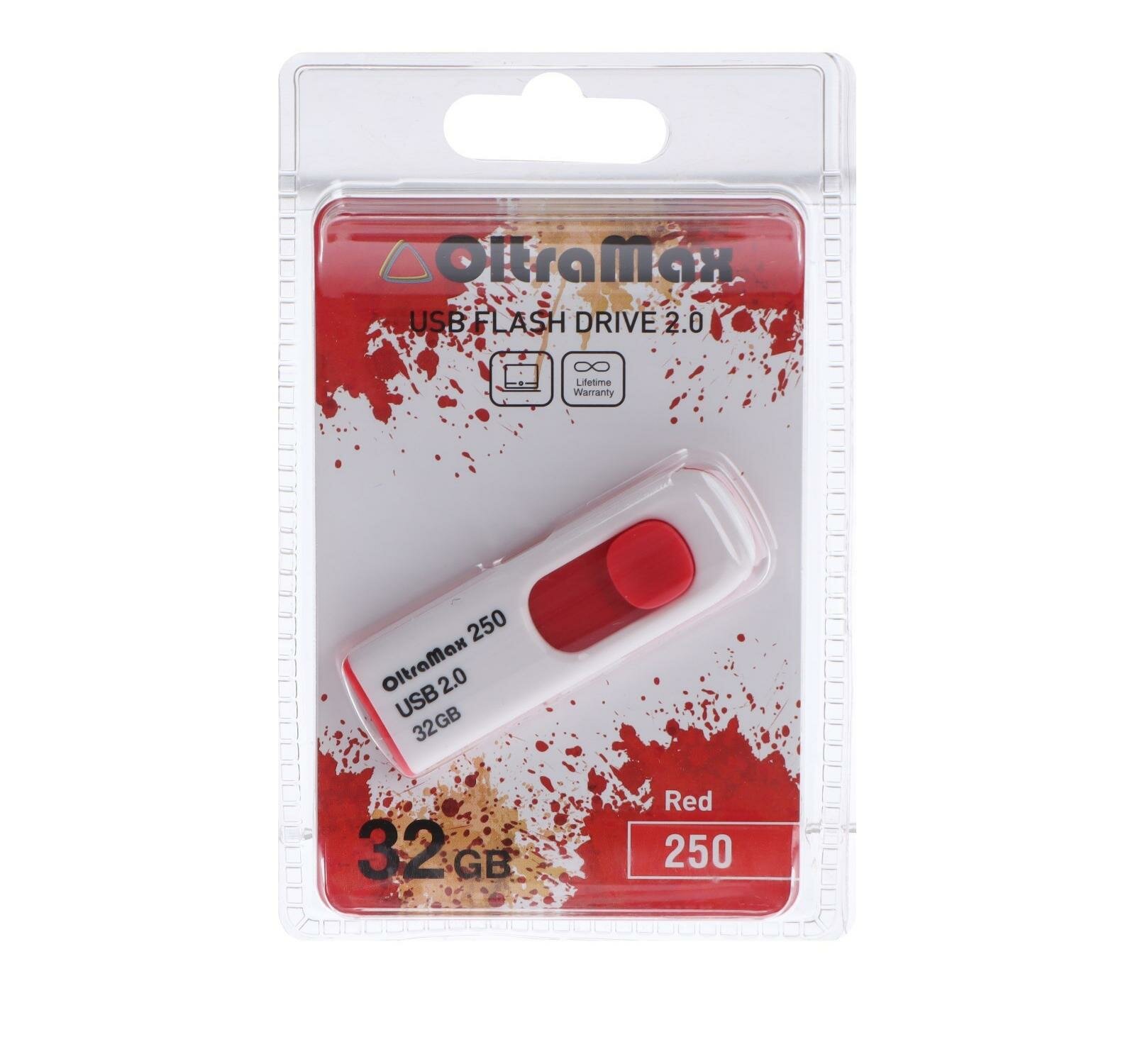 Флешка OltraMax 250, 32 Гб, USB2.0, чт до 15 Мб-с, зап до 8 Мб-с, красная