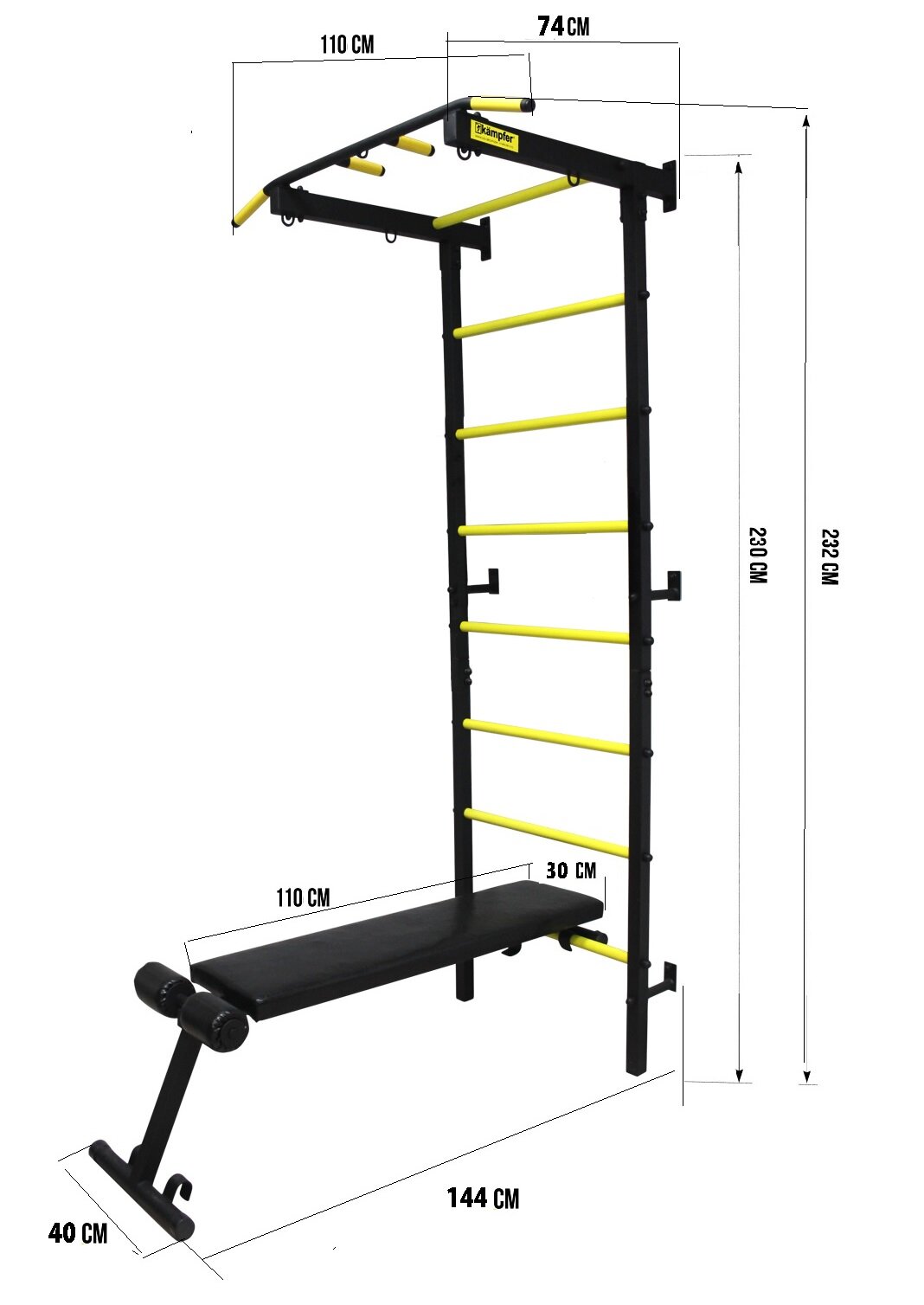 Шведская стенка профессиональная Kampfer Mustang Powerful высота 232 см, турник, скамья для жима, наклонная доска для пресса, крепление к стене / металлический спортивный комплекс для дома