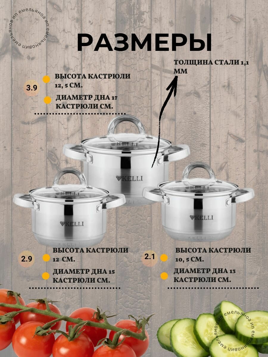 | Комплектация | кастрюли: 2.1 л, 2.9 л, 3.9 л; 3 крышки |