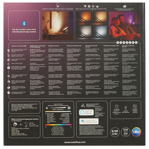 | Дополнительная информация | поддерживает эффект рассеянного света; цветовая температура 2000–6500 Hue White Color Ambiance; срок службы до 25 000 часов; код IP20, защита от предметов размером более 12,5 мм, защита от попадания воды отсутствует; совместимость с блоком управления Hue Bridge (приобретается отдельно); аксессуары, входящие в комплект: адаптер питания, штепсельная вилка британского стандарта |