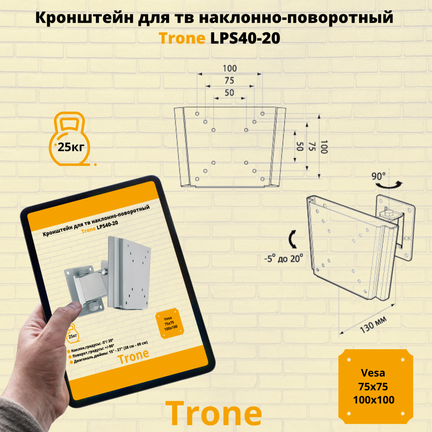 Кронштейн для телевизора на стену наклонно-поворотный с диагональю 15"-27" Trone LPS 40-20,серебро интересное: