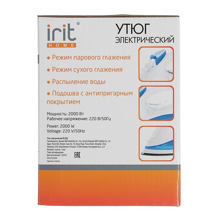 Утюг Irit IR-2222, 2000 Вт, антипригарная подошва, 350 мл, бело-голубой./В упаковке шт: 1 интересное: