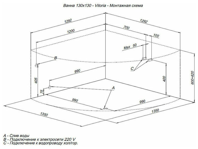 Ванна акриловая Aquanet VITORIA 130*130 (204049)