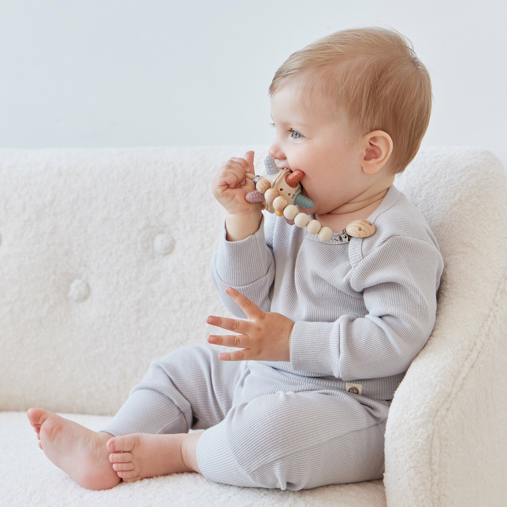 11027, Держатель для пустышки Happy Baby держатель для соски, на прищепке, силиконовые бусины, светло-серый