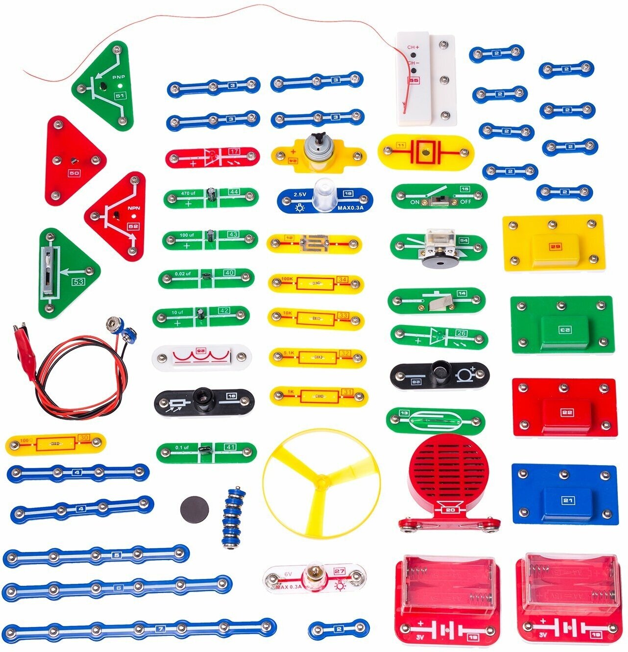 | Комплектация | руководство пользователя, схема расположения элементов, подставка, провода для соединений, пьезоизлучатель, сенсорная пластина, контакт с магнитом, выключатель с кнопкой, выключатель, фоторезистор, светодиоды – красный и зеленый, лампы 2.5 и 6V, специальные крепления для батареек, динамик, несколько вариантов интегральных схем, электрический мотор с пропеллером, антенна, микрофон, резисторы, конденсаторы, транзисторы, реостат |